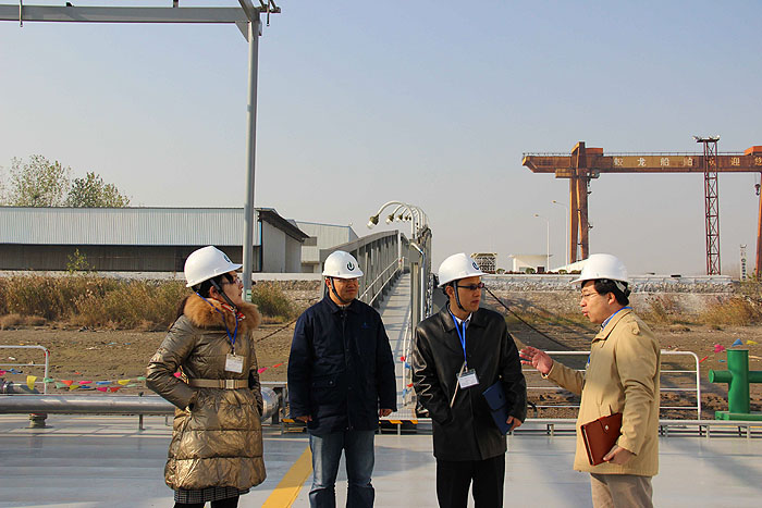 ????李主席一行饒有興致地登上海港星01號加氣躉船,對卸車裝置、進氣管廊、儲氣罐體、加注設(shè)備、中控系統(tǒng)等逐一了解;對該項目的實施背景、建設(shè)過程、運行情況、國家政策、創(chuàng)新舉措等詳細詢問,并不時與現(xiàn)場人員進行交流。