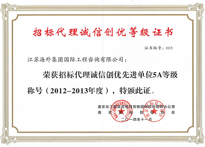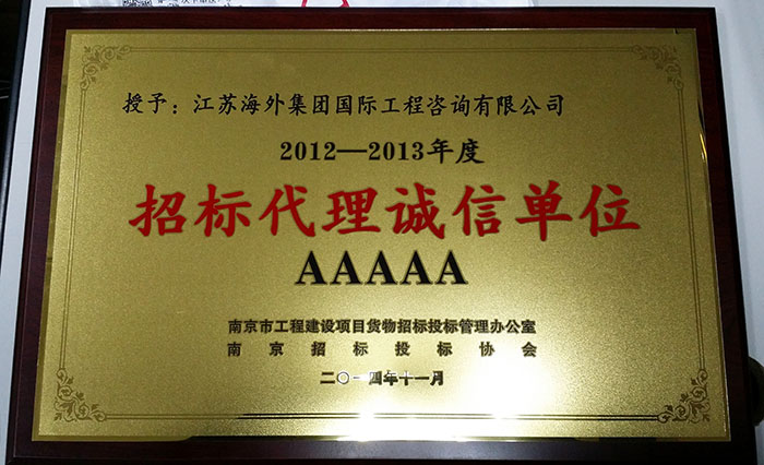 ????????2014年9月,我公司參加了由南京市工程建設(shè)項目貨物招標(biāo)投標(biāo)管理辦公室和南京招標(biāo)投標(biāo)協(xié)會聯(lián)合舉辦的2012-2013年度“招標(biāo)代理誠信創(chuàng)優(yōu)先進單位”的評選活動。經(jīng)評審小組評定,我司被授予2012-2013年度招標(biāo)代理“誠信創(chuàng)優(yōu)”AAAAA級先進單位榮譽稱號,這是公司連續(xù)兩次獲得此項殊榮。
