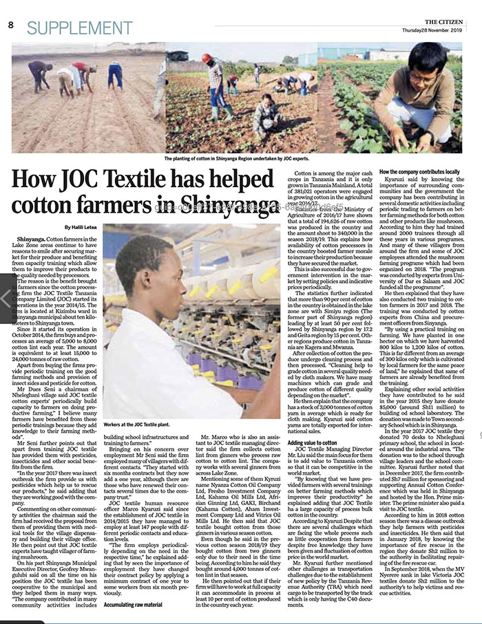????????2019年11月28日,坦桑尼亞主流報(bào)刊媒體MWANANCHI(《公民報(bào)》)分別在其斯瓦西里語(yǔ)報(bào)紙MWANANCHI及英文報(bào)紙CITIZEN上同時(shí)整版刊登江蘇-新陽(yáng)嘎農(nóng)工貿(mào)產(chǎn)業(yè)園暨區(qū)內(nèi)企業(yè)海企紡織(坦桑尼亞)有限公司近幾年來通過棉花種植培訓(xùn)、紡織技能培訓(xùn)、公益捐助等方式為周邊農(nóng)戶、工廠員工和所在區(qū)域政府帶來惠利的事跡。