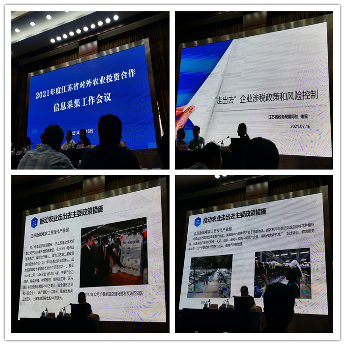????????為推進(jìn)實(shí)施國(guó)家農(nóng)業(yè)“走出去”戰(zhàn)略,同時(shí)為政府和企業(yè)農(nóng)業(yè)對(duì)外投資決策提供支撐服務(wù),2021年度企業(yè)對(duì)外農(nóng)業(yè)投資合作信息采集工作會(huì)議于2021年7月16日在蘇州昆山市召開(kāi)。省農(nóng)村農(nóng)業(yè)廳外合處田處長(zhǎng)、江蘇稅務(wù)總局喻處長(zhǎng)、省商務(wù)廳外經(jīng)處科員高科長(zhǎng)以及各“走出去”企業(yè)代表出席本次會(huì)議。我司代表受邀出席。